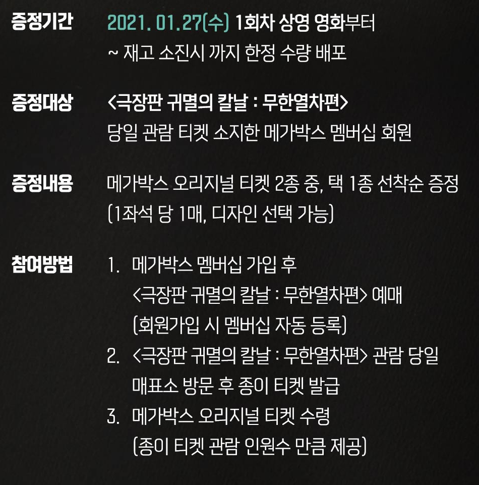 | 메가박스 귀멸의 칼날 스페셜 굿즈 판매 이벤트! - 직소 퍼즐, 캐릭터 카드 (0) | 2021.01.27 |