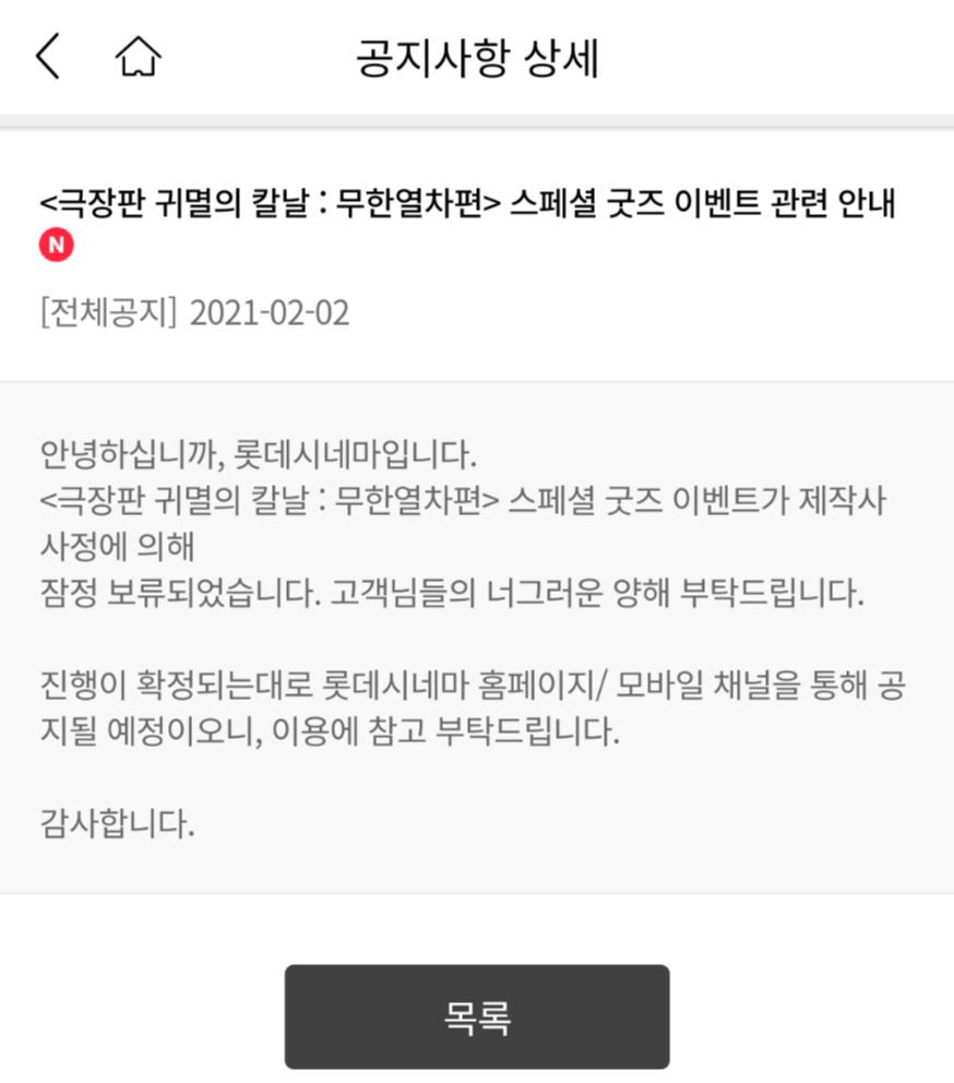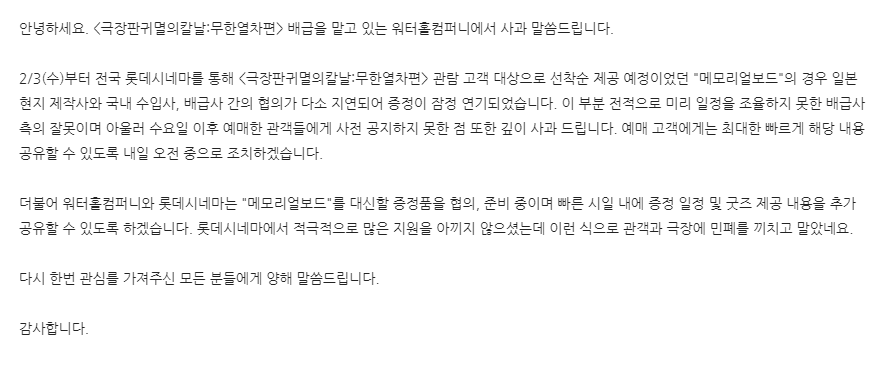 안녕하세요? 2월2일 갑작스럽게 잠정 중단되었던 롯데시네의 귀멸의 칼날 무한열차 특전이벤트가, 새로운 특전으로 변경되어 다시 공개되었습니다. [기존 특전 이벤트] 2월3일 개봉일 '메모리얼